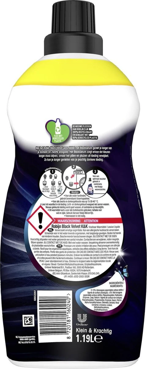 De verbeterde Robijn Black Velvet formule bevat 80% biologisch afbreekbare ingrediΓ«nten. We zijn op weg naar volledig biologisch afbreekbare formules. De vertrouwde effectiviteit en bekende geuren van Robijn, gecombineerd met de kracht van de natuur. Goed voor je kleding en beter voor de planeet. Bovendien zijn de flessen gemaakt van 95% gerecycled plastic en zijn ze 100% recyclebaar. Op deze manier draagt Robijn bij aan een duurzamere manier van wassen.