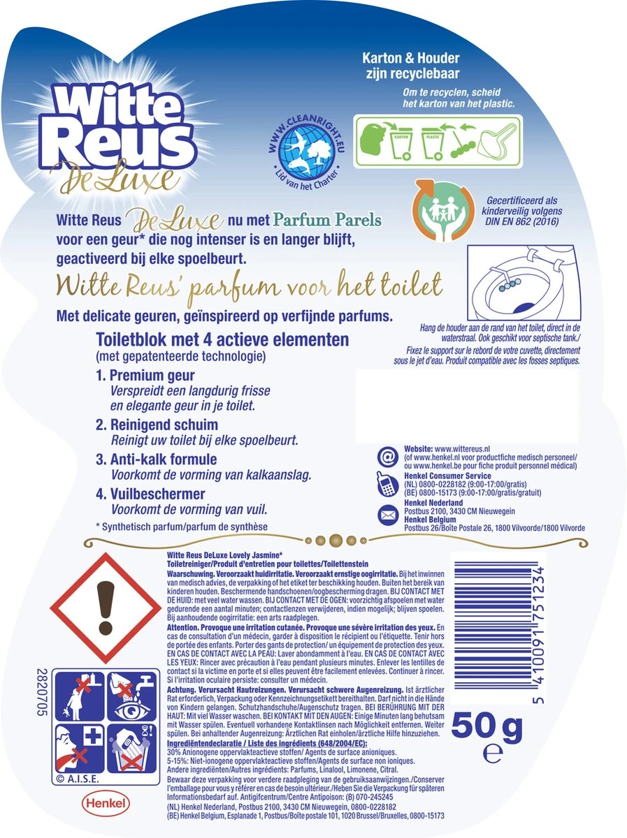 Vind jij ook dat je toilet een unieke en luxe geur verdient? Witte Reus De Luxe Lovely Jasmine is het eerste toiletblok met parfum die uw toilet een elegante en premium geur geeft. De geur is geΓ―nspireerd door verfijnde parfums, maar het product geeft je ook de vertrouwde Witte Reus frisheid.